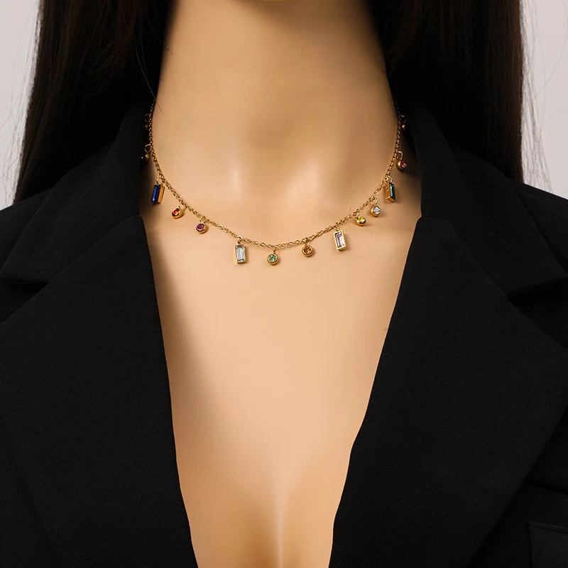 O colar é muito bonito, fino, com algumas joias coloridas e modernas.